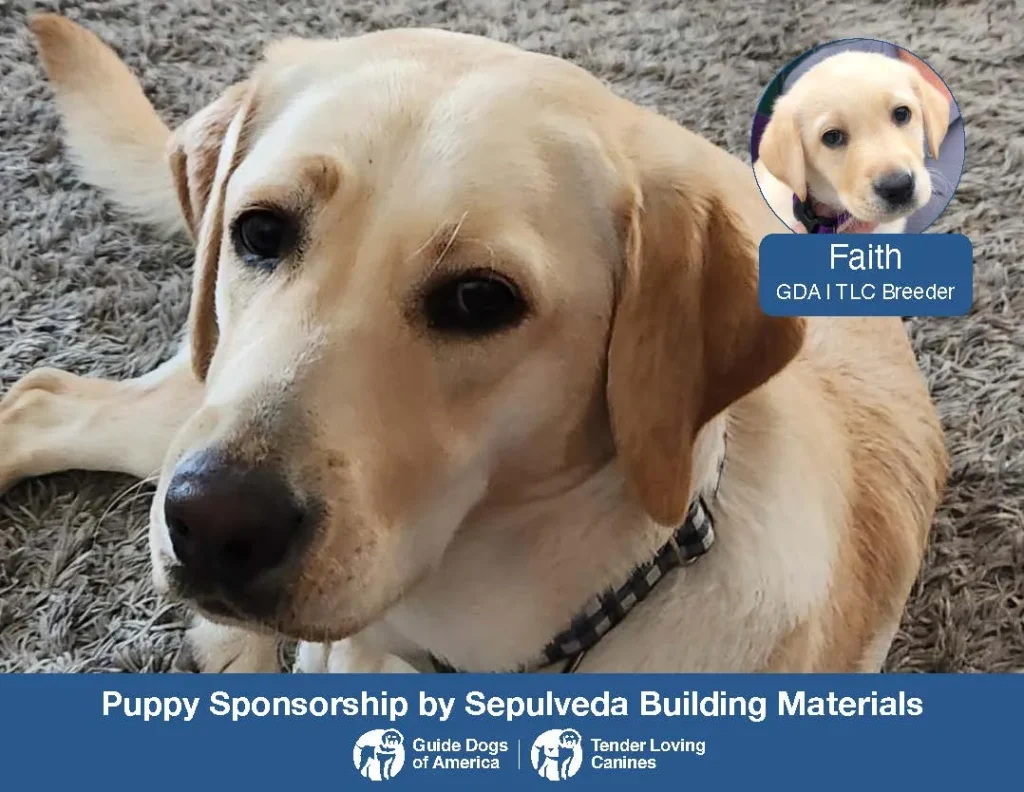 Meet Sepulveda’s sponsored breeder, Faith. A darling Yellow Labrador, she was born on 1-6-22 and being raised by Pam and Bob. Faith has been taken into our breeder program.