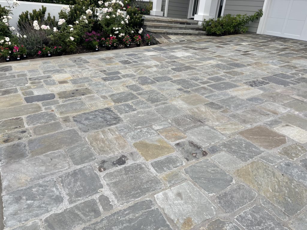 Autumn Breeze truly stands out when used in driveway designs. Its cool blue tones offer a refined contrast against concrete and landscaping, giving even the simplest layout a custom, high-end finish. One of the most effective applications is incorporating tumbled 6″x6″ Autumn Breeze cobblestones as ribbons or borders within a concrete driveway. This approach immediately elevates the aesthetic, adding both structure and visual interest without requiring a full paver installation.